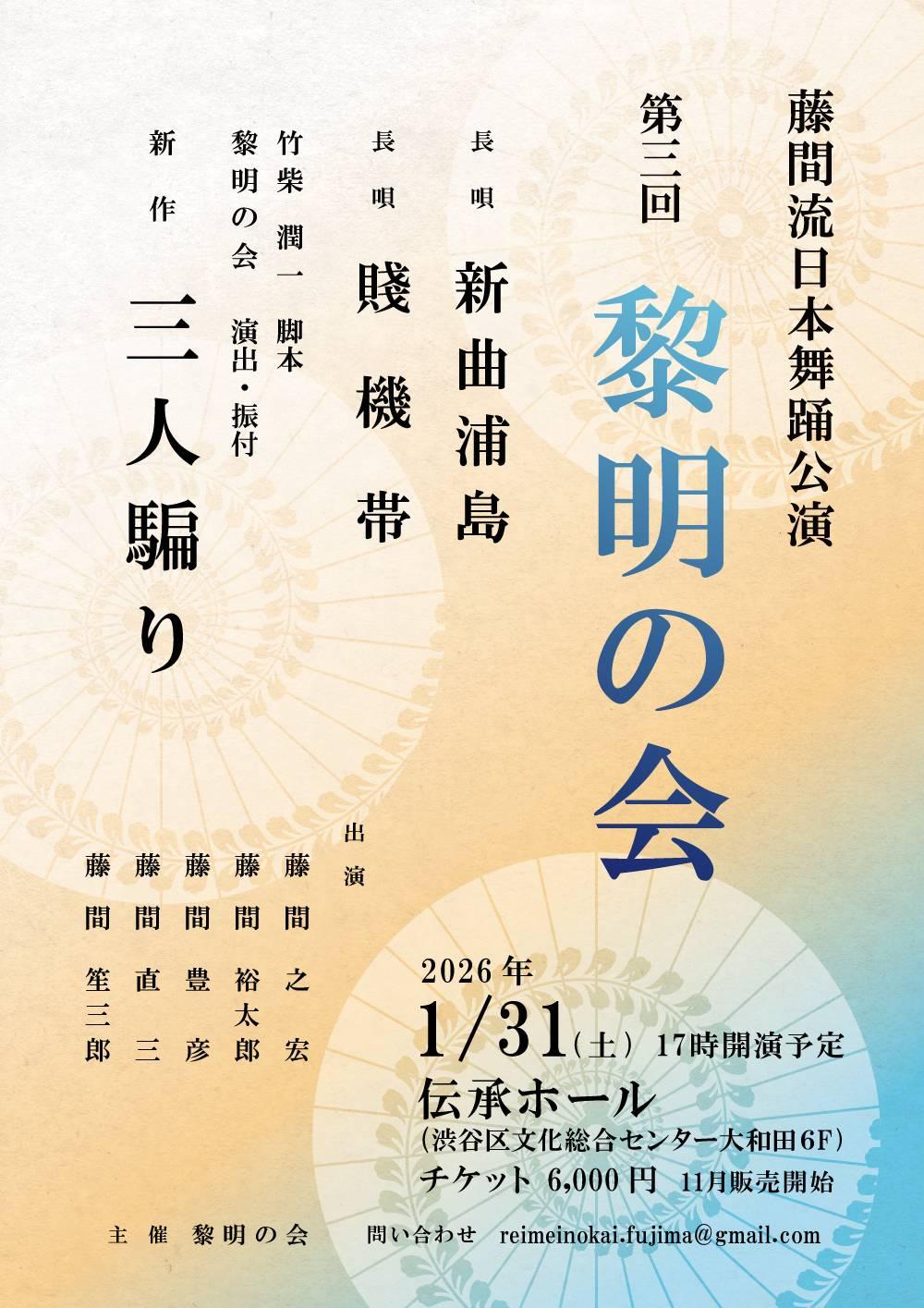江戸東京博物館主催公演 日本舞踊公演「ボレロ」(振付補) 原案:二代目花柳壽應 振付:花柳源九郎 振付補:藤間直三 出演:市川翠扇 西川箕乃三郎、花柳寿々彦、藤間直三、藤間涼太朗 |